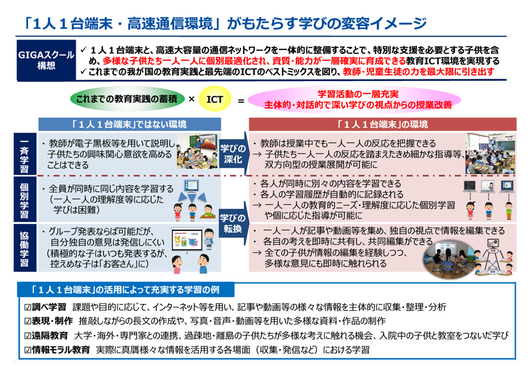 その目的は、「1人1台端末と、高速大容量の通信ネットワークを一体的に整備することで、特別な支援を必要とする子供を含め、多様な子供たちを誰一人取り残すことなく、公正に個別最適化され、資質・能力が一層確実に育成できる教育環境を実現する」ものです。それ以降、全国の自治体でGIGAスクール構想が加速化しました。